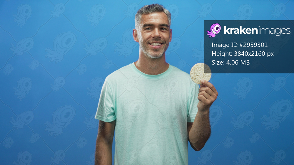 Middle aged man with grey hair wearing mint t shirt holding round corn pastry rice cake with right hand and smiling in studio blue backdrop; healthy snack contentment. - Kraken Images