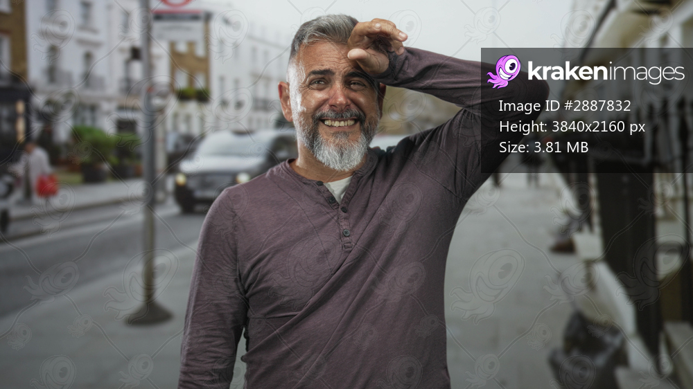 Middle aged man with hand to forehead smiling on city street, beard visible and arms sometimes crossed; maturity confidence joy.