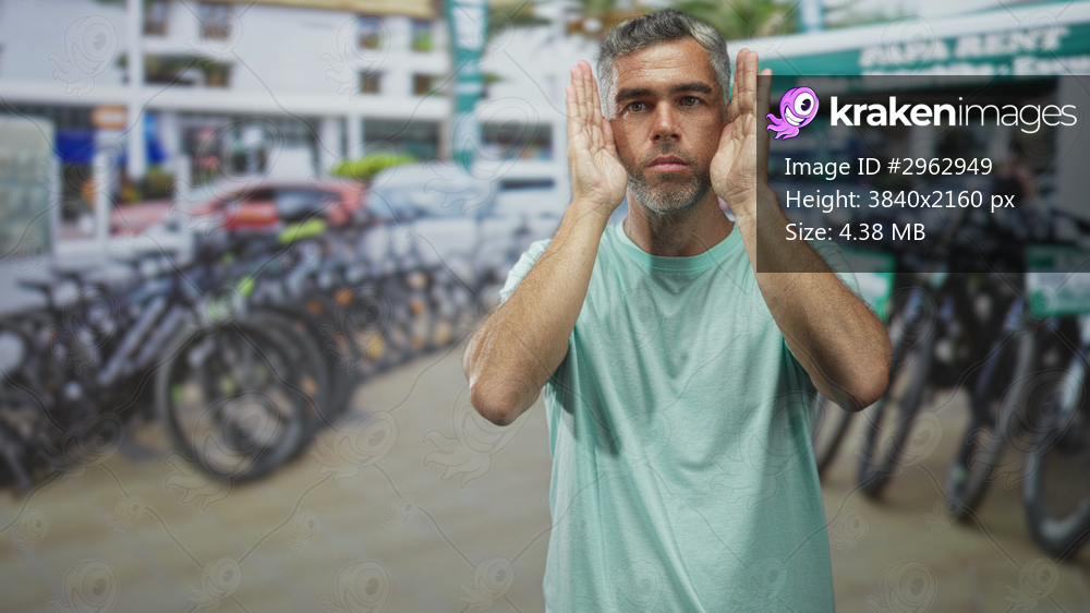 Middle aged man with hands covering his face beside a row of bicycles at a bike rack on street near storefronts, palms pressed in a cover gesture; frustration introspection. - Kraken Images