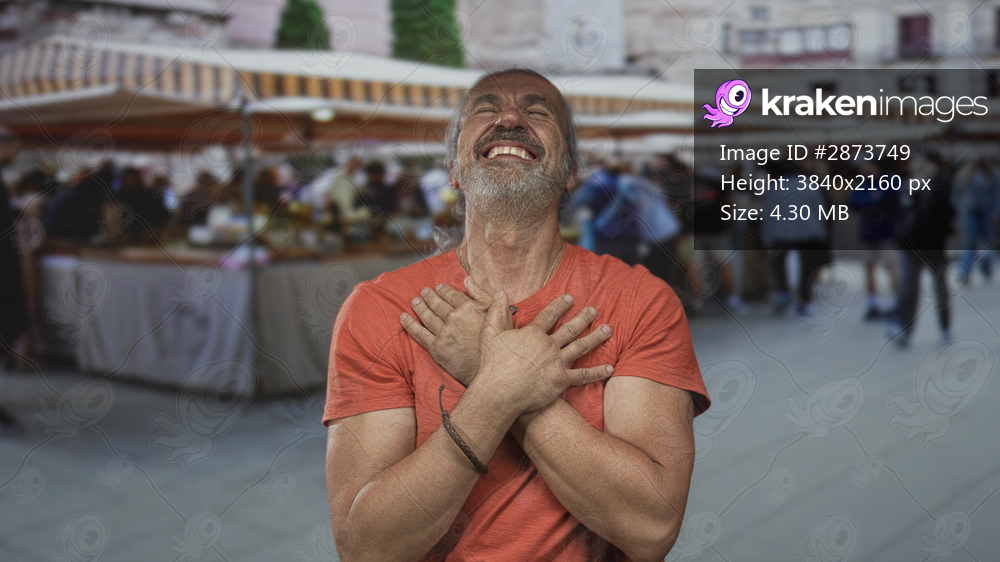 Middle aged man with hands crossed over chest and pointing fingers toward camera in street market; joyful gratitude.