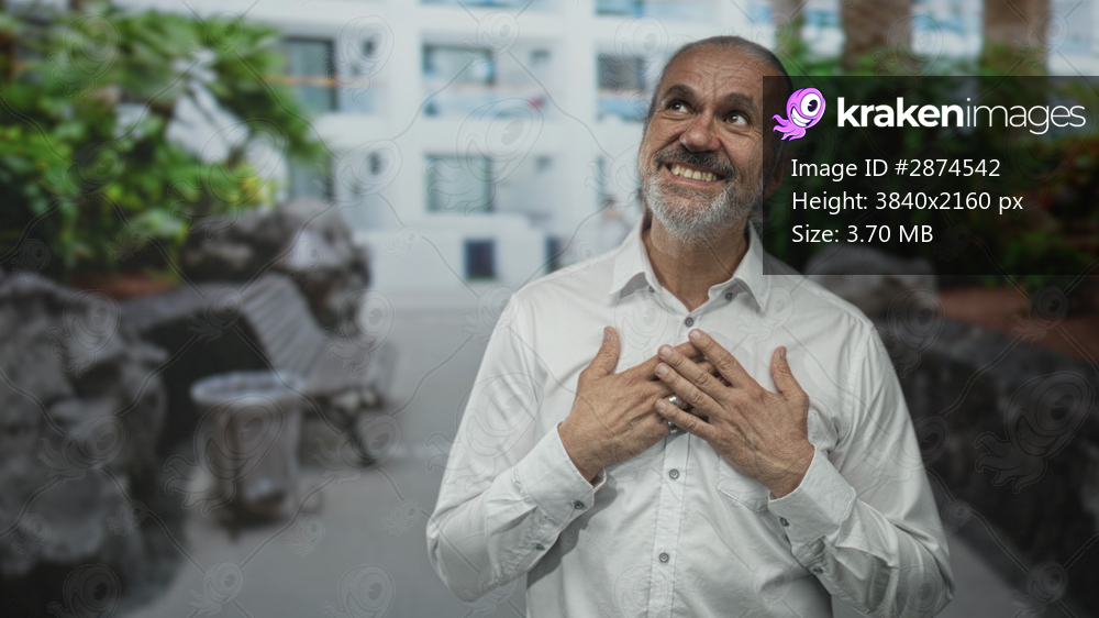 Middle aged man with hands on chest smiling and looking upward in front of a residential building courtyard; gratitude.