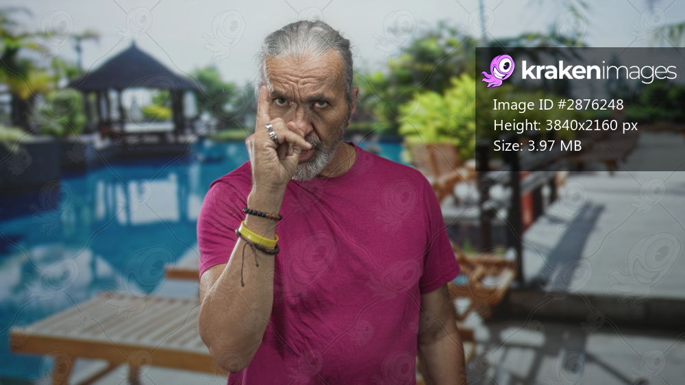 Middle aged man with hoary long hair and beard points finger at camera beside hotel pool and resort building; stern warning.