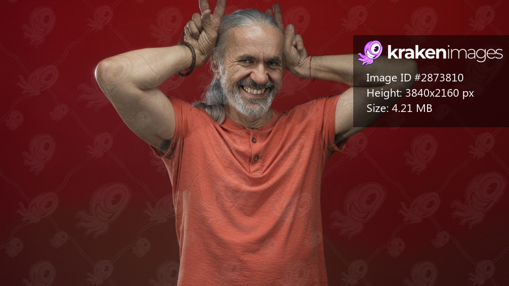 Middle aged man with hoary long hair makes peace sign with hands in red studio; playful mischief warm grin.
