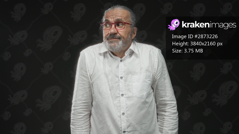 Middle aged man with hoary long hair and red glasses shrugs shoulders in studio against black wall; uncertainty reflection.