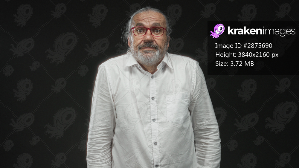 Middle aged man with hoary long hair and red glasses shrugs shoulders in studio against black wall; uncertainty reflection.