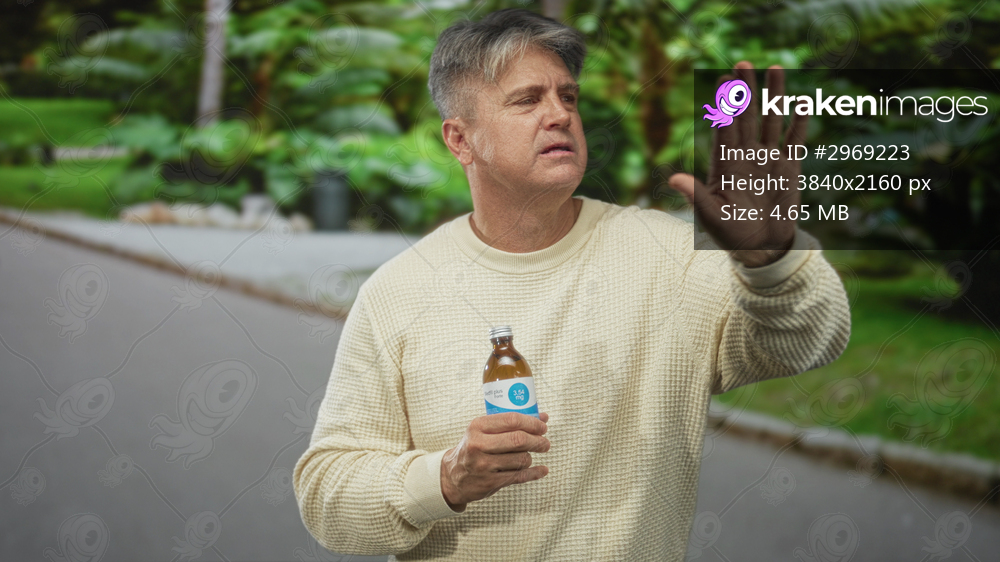 Middle aged man holding bottle points finger on street beside park path while inspecting a label and squinting; uncertainty inspection.