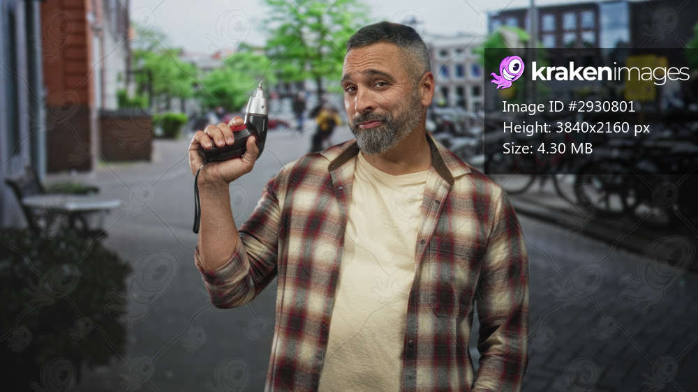 Middle aged man holding electric drill in bare hand on street, smiling and tilting head, wearing plaid shirt and t shirt; pride in craft.