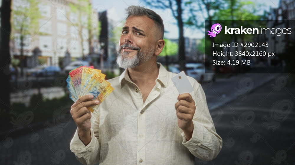Middle aged man holding fanned swiss franc banknotes and white card on street in city, showing money gesture; confident wealth success.