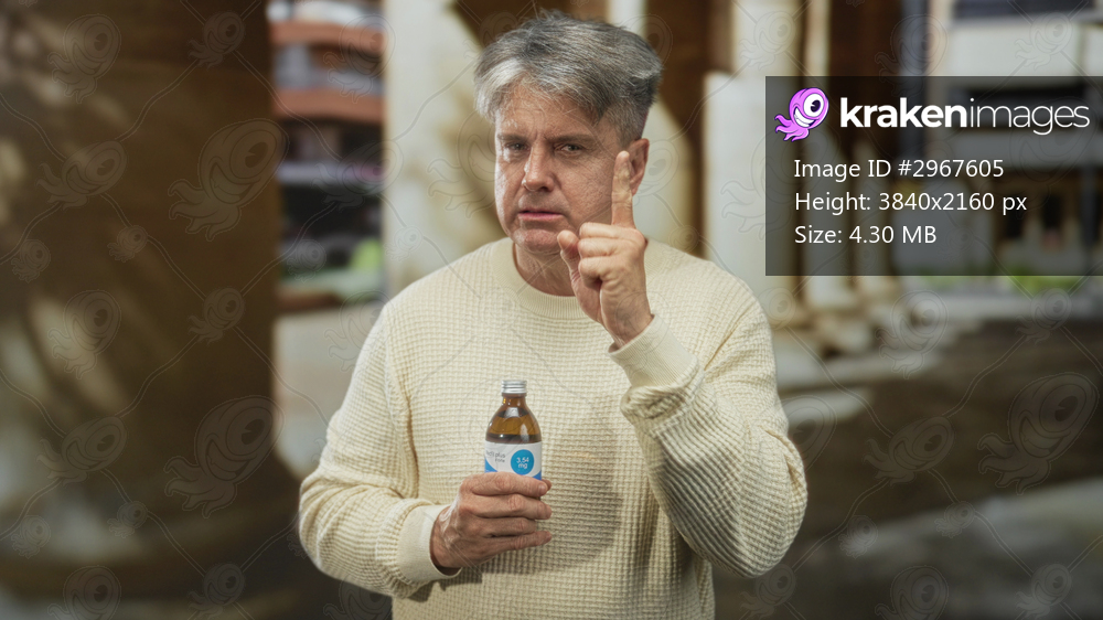 Middle aged man holding medicine bottle and clenching fist near chest in front of building colonnade; health concern.