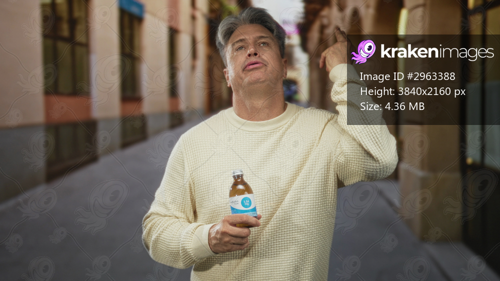 Middle-aged man holding medicine bottle and pointing finger in a narrow street arcade with archway and cream sweater; weary solitude.