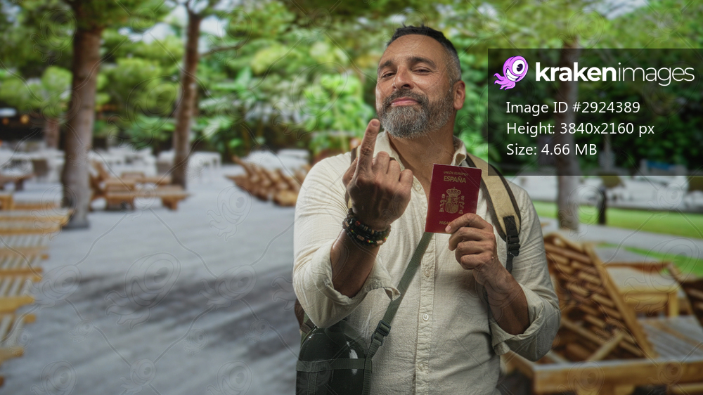 Middle-aged man holding spanish passport and showing middle finger gesture in forest setting with backpack and water canteen; defiance.