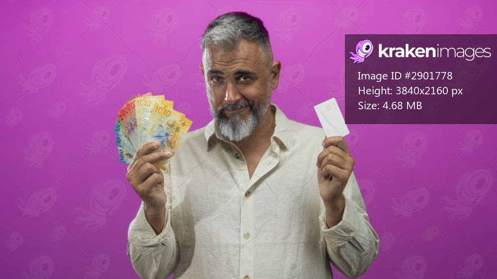 Middle-aged man holding swiss franc banknotes and displaying a payment card in studio with magenta backdrop; confidence finance success.
