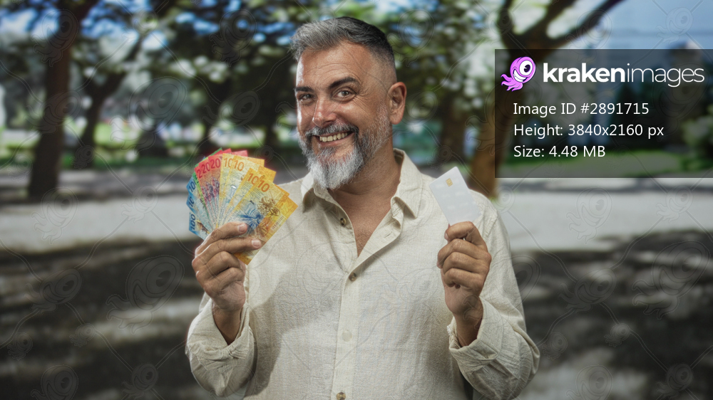 Middle aged man holds fanned swiss franc banknotes and a white creditcard on street near trees; financial success confidence.