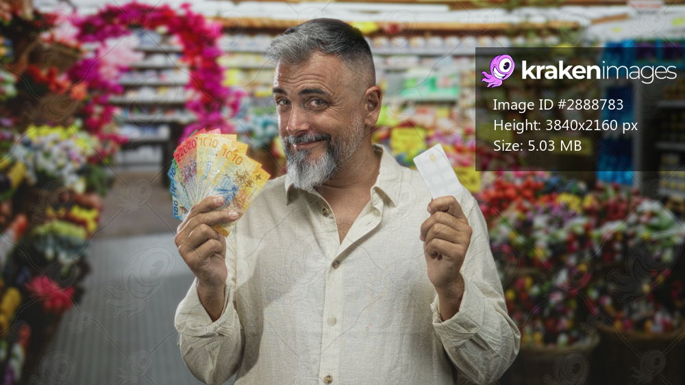 Middle aged man holds swiss franc banknotes fan and a blank card inside a building, smiling and showing hands; confidence wealth planning.