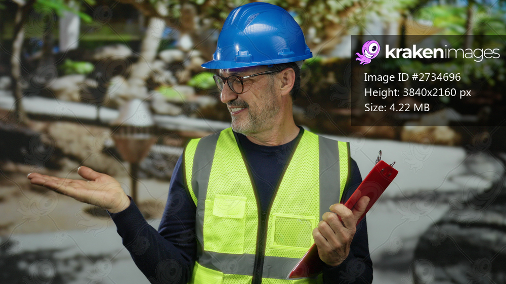Middle-aged man in safety vest and hard hat smiles in outdoor urban park setting holding clipboard.