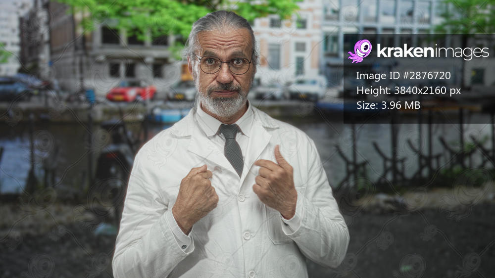Middle aged man in white lab coat and tie points thumbs to chest on street by amsterdam canal, urban outdoors; confidence charm.