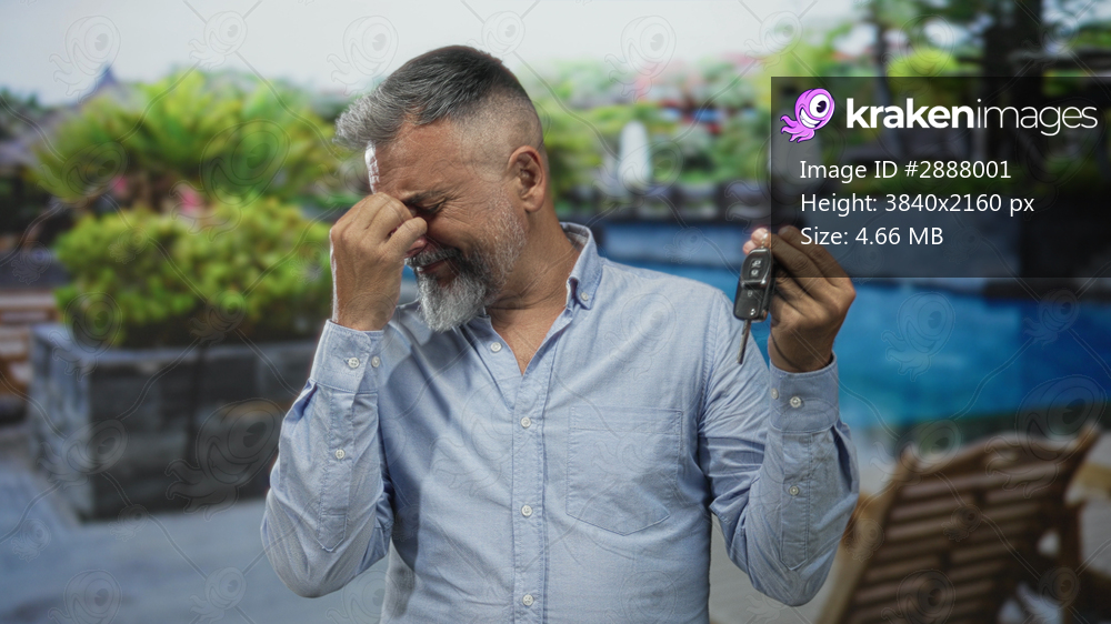 Middle aged man pinching nose and holding car keys beside resort pool in front of hotel building; travel frustration.