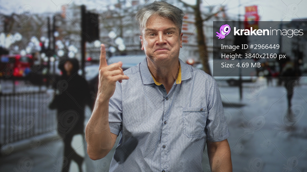 Middle aged man pointing index finger upward on busy wet street, smiling in short sleeve shirt and grey hair; confidence approachability.
