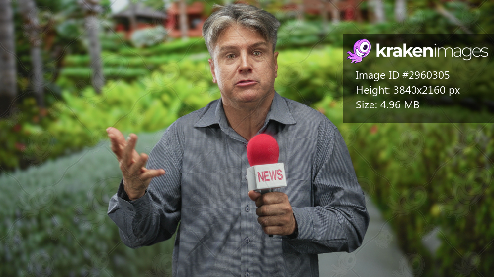 Middle aged man reporter with grey hair holding red microphone and gesturing with open hand on a manicured garden path; on air concern.