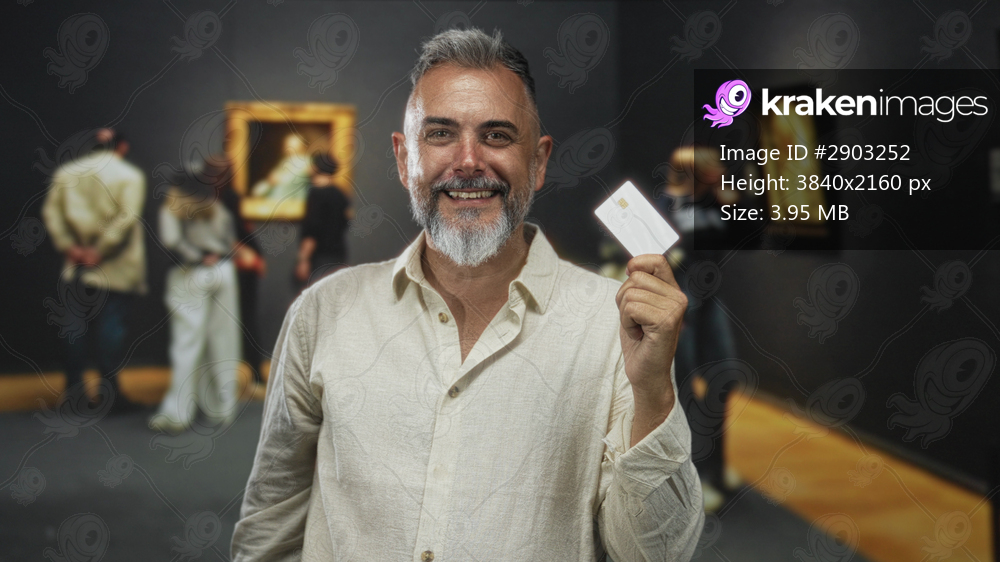 Middle aged man smiling and holding a white creditcard near his face in a gallery building; confidence trust finance.