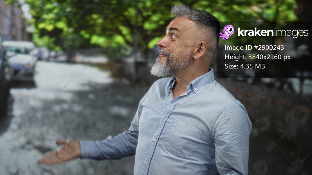 Middle aged man smiling with open palms on a tree lined city street with parked cars and cobblestone pavement; surprise wonder.