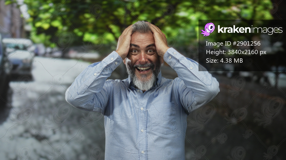 Middle aged man smiling with open palms on a tree lined city street with parked cars and cobblestone pavement; surprise wonder.