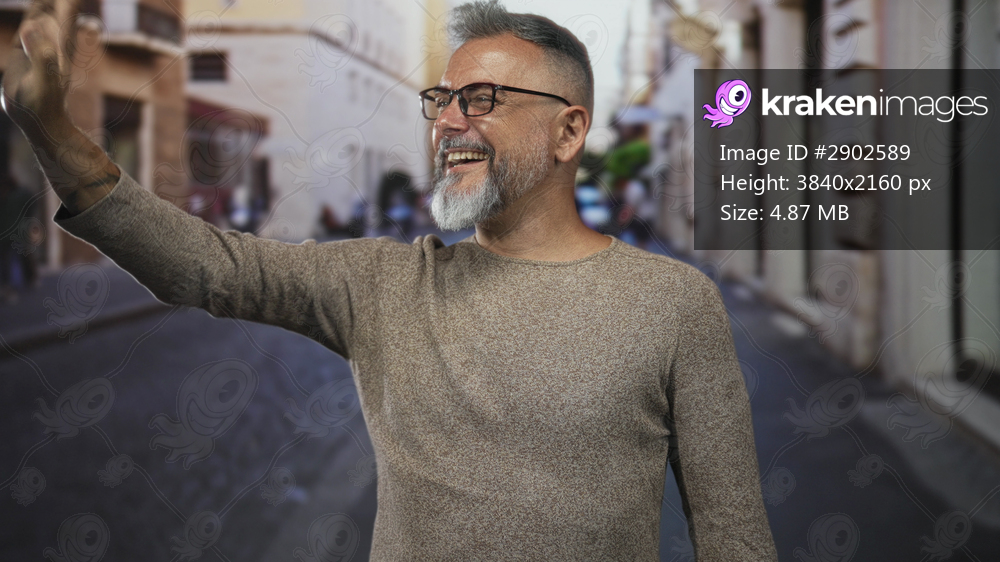 Middle aged man smiling and waving hand on a cobblestone city street, wearing glasses and knit sweater; joy travel connection.