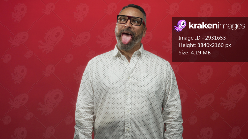 Middle aged man sticks tongue out showing tongue and glasses, wearing white patterned shirt and grey beard in red studio; playful mischief.