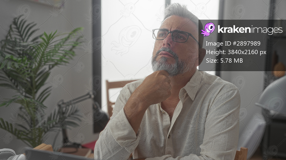 Middle aged man typing on laptop with hand on chin in building home office; contemplation focus concentration.