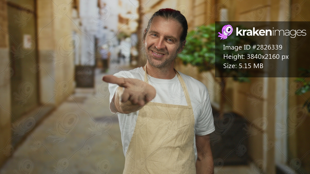 Middle aged man wearing beige apron and white shirt extends open hand toward camera on street; kindness warmth.