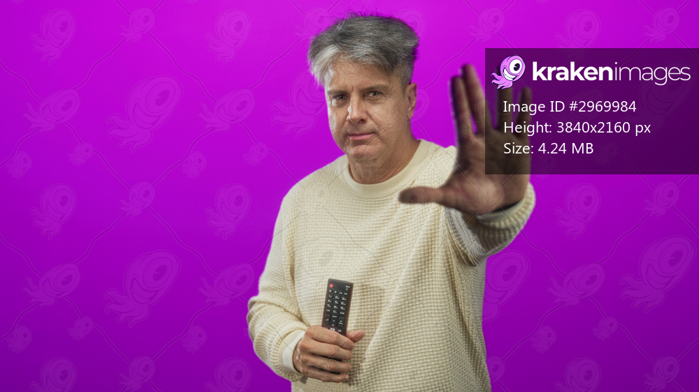 Middle aged man wearing beige sweater holding remote with palm to camera stop gesture in studio; control calm.