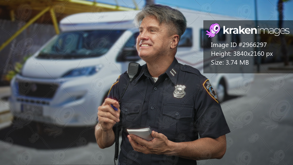 Middle aged police officer man writing in notepad with pen while holding radio beside white rv on sunny street; duty service.