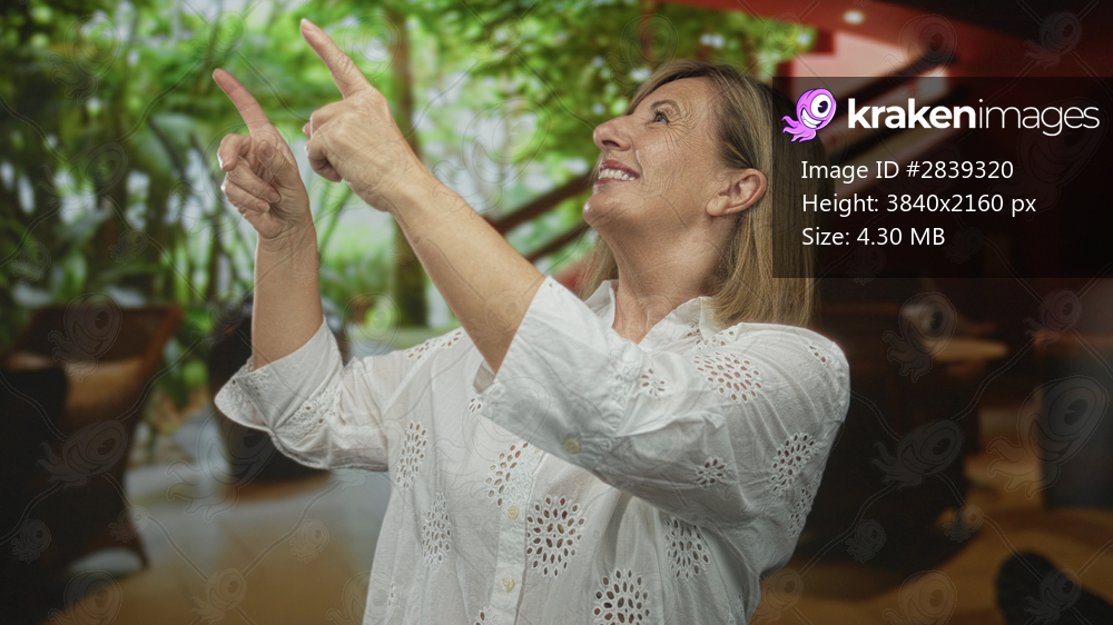 Middle aged smiling woman in white lace blouse points finger upward in resort building interior; optimism.