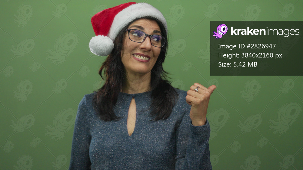 Middle aged smiling woman wearing santa hat and glasses pointing thumb in green studio; holiday cheer.
