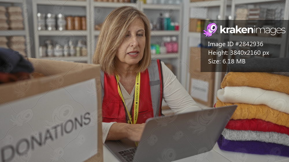 Middle aged volunteer woman typing on laptop at busy indoor donation center with stacked clothing boxes; compassion.