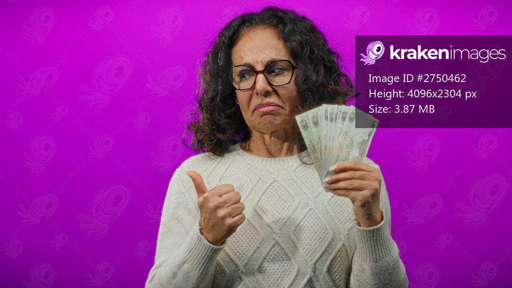 Middle-aged woman with a puzzled expression holds uae dirham banknotes on a purple background while pointing to the side with her thumb.