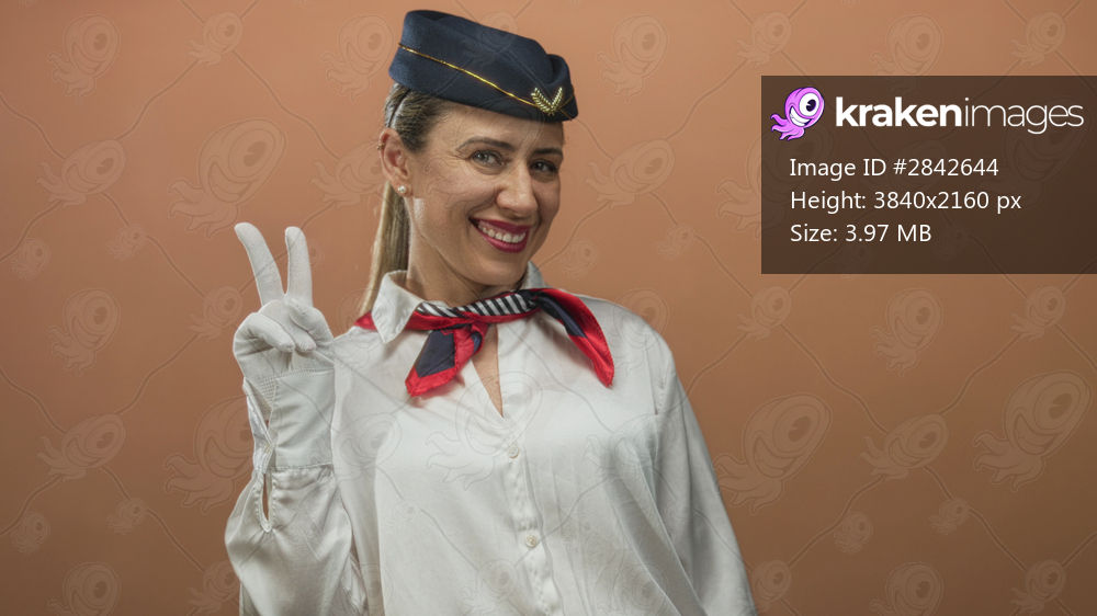 Middle aged woman air hostess makes white glove peace sign gesture in studio with warm peach backdrop; optimism.