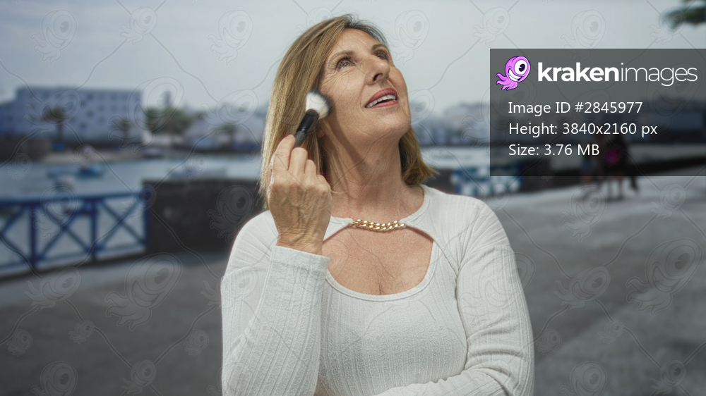 Middle aged woman applies makeup brush to chin on sunny street by the sea in a white sweater; serenity.