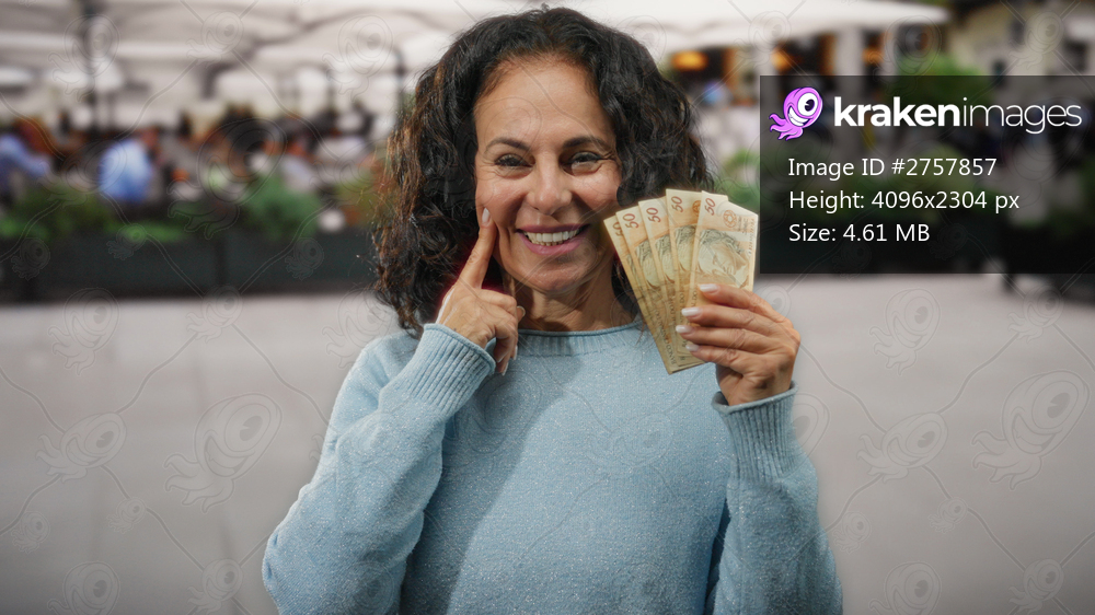 Middle-aged woman at outdoor cafe terrace playfully puffing cheeks holding brazilian banknotes creating a joyful scene with urban background and diverse people around. - Kraken Images