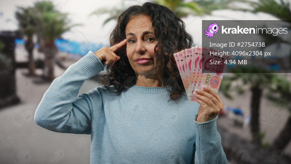 Middle-aged woman at seaside holding chinese yuan with a thoughtful gesture, symbolizing financial contemplation by the beach.