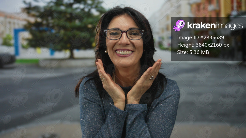 Middle aged woman with black glasses covers her mouth with both hands on street in a city square; happiness.