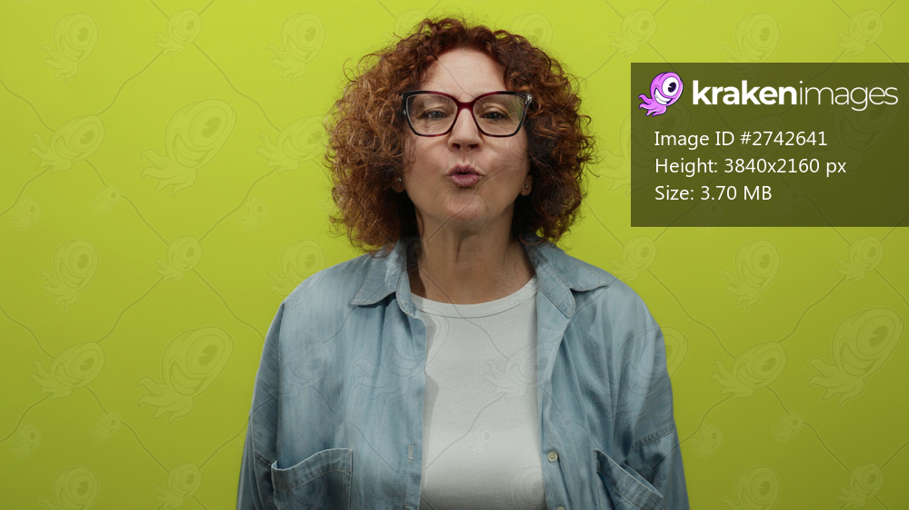 Middle-aged woman with brunette hair making a kiss gesture against vibrant yellow background wearing casual clothing and glasses expressing cheerful emotion. - Kraken Images