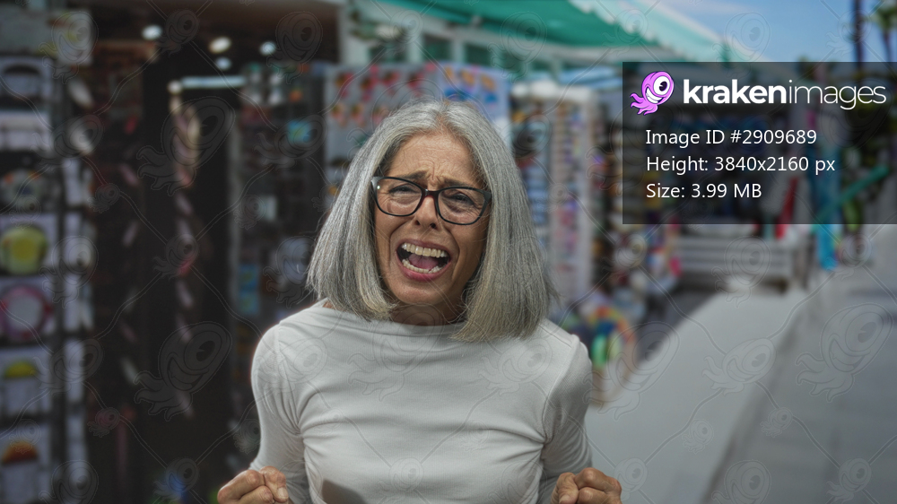 Middle aged woman with clenched fists shouting in a busy street souvenir market aisle, grey hair and glasses, wearing white top; frustration outburst.