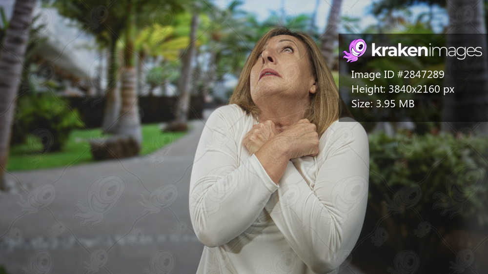 Middle aged woman clutches chest and tilts head back among palm trees on a lush park pathway; anxiety.