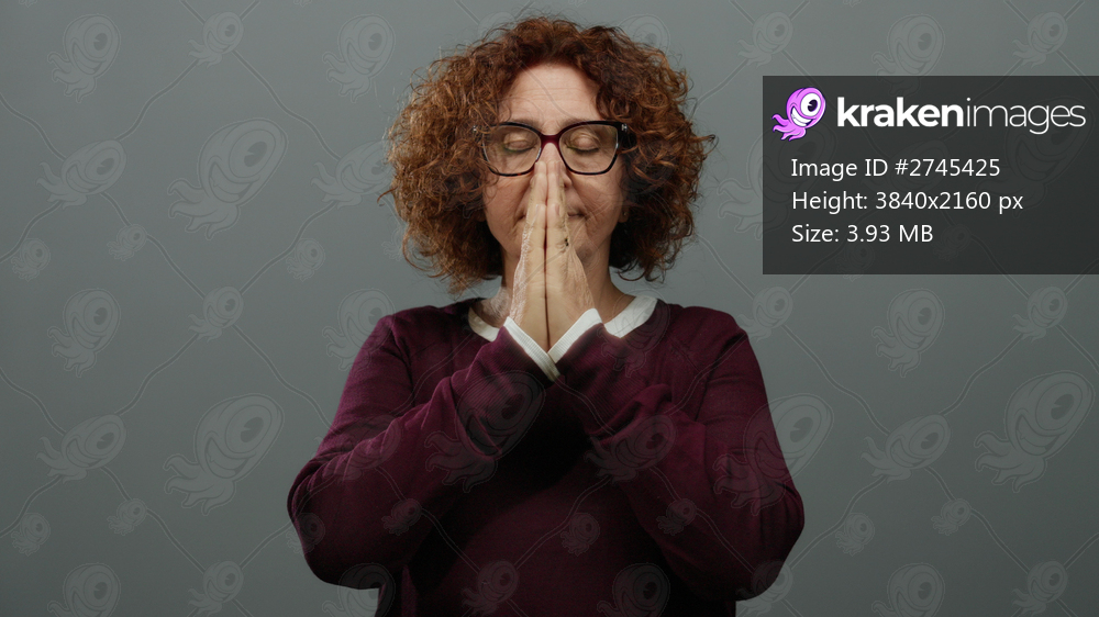 Middle-aged woman with curly brown hair in a maroon sweater meditates with closed eyes against a grey background, exuding peace and concentration.