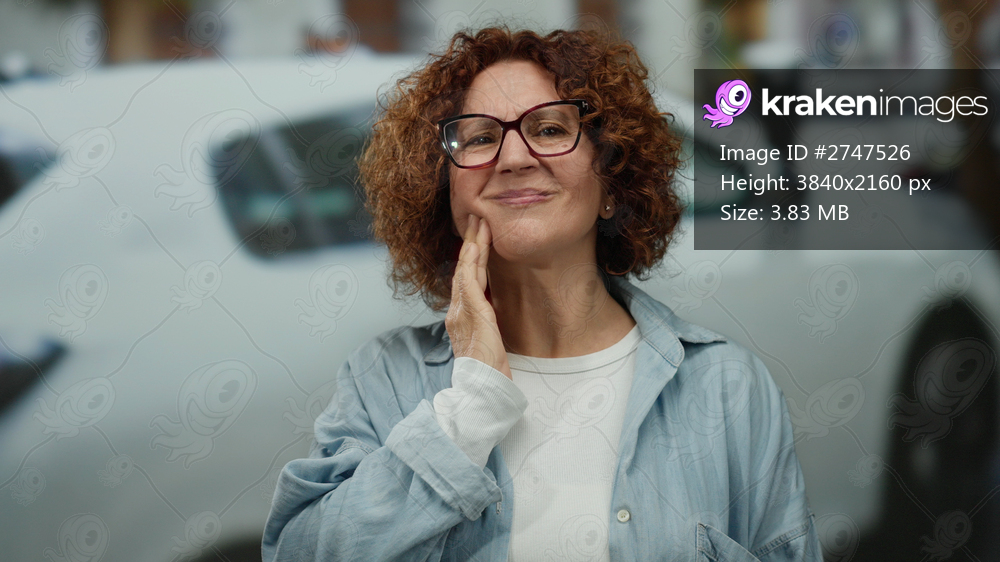 Middle-aged woman with curly hair and glasses standing outdoors on a city street, smiling gently with one hand on her cheek, and a blurry white car in the background. - Kraken Images