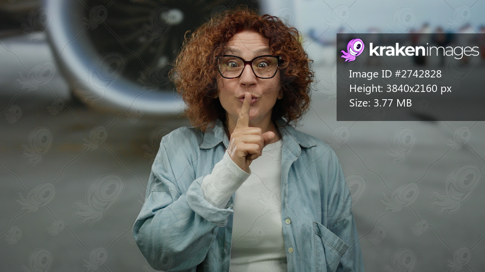 Middle-aged woman with curly hair stands at airport terminal, gesturing silence as she smiles outdoors near airplane with passengers in the background, conveying travel and secrecy. - Kraken Images