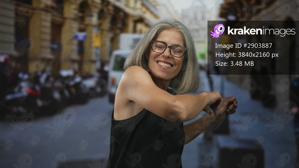 Middle aged woman dancing with raised arm and smiling face on a busy city street by parked cars and scooters; joy celebration.