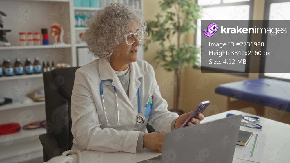 Middle-aged woman doctor with grey hair in a clinic, wearing a stethoscope and glasses, using a smartphone and laptop, with medical supplies and a plant in the background. - Kraken Images