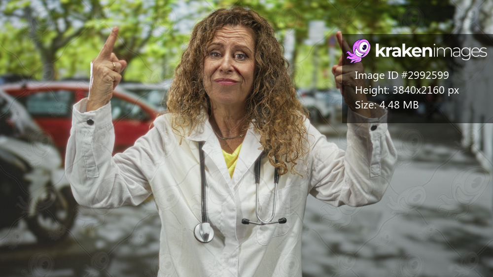 Middle aged woman doctor in white coat with stethoscope raises both middle fingers with furrowed brow on a tree lined street; defiance rebellion.